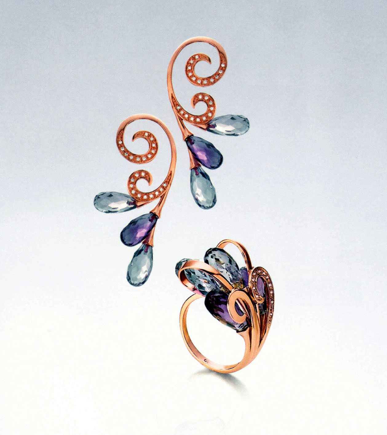 Rococó Peça: Anel e Brincos Cliente: Manoel Bernardes Joias Material:Ouro, diamante, iolita e ametista Foto: divulgação |